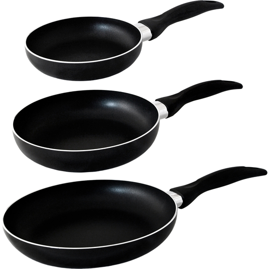 Se acompaña de un juego de 3 sartenes imprescindible para tu cocina, fabricadas en aluminio prensado, con exterior revestido en negro, resistente a altas temperaturas, e interior antiadherente en negro.