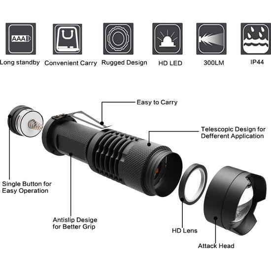 Zoom Ajustable: La linterna cuenta con un enfoque ajustable que le permite seleccionar entre un campo focalizado o extenso. Disfruta de un alcance de luz blanca de hasta 50-100 metros.